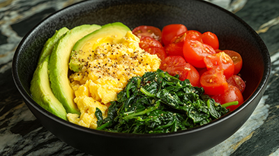 - Scrambled eggs (2 eggs, 1 tsp. butter, pinch of sea salt)
