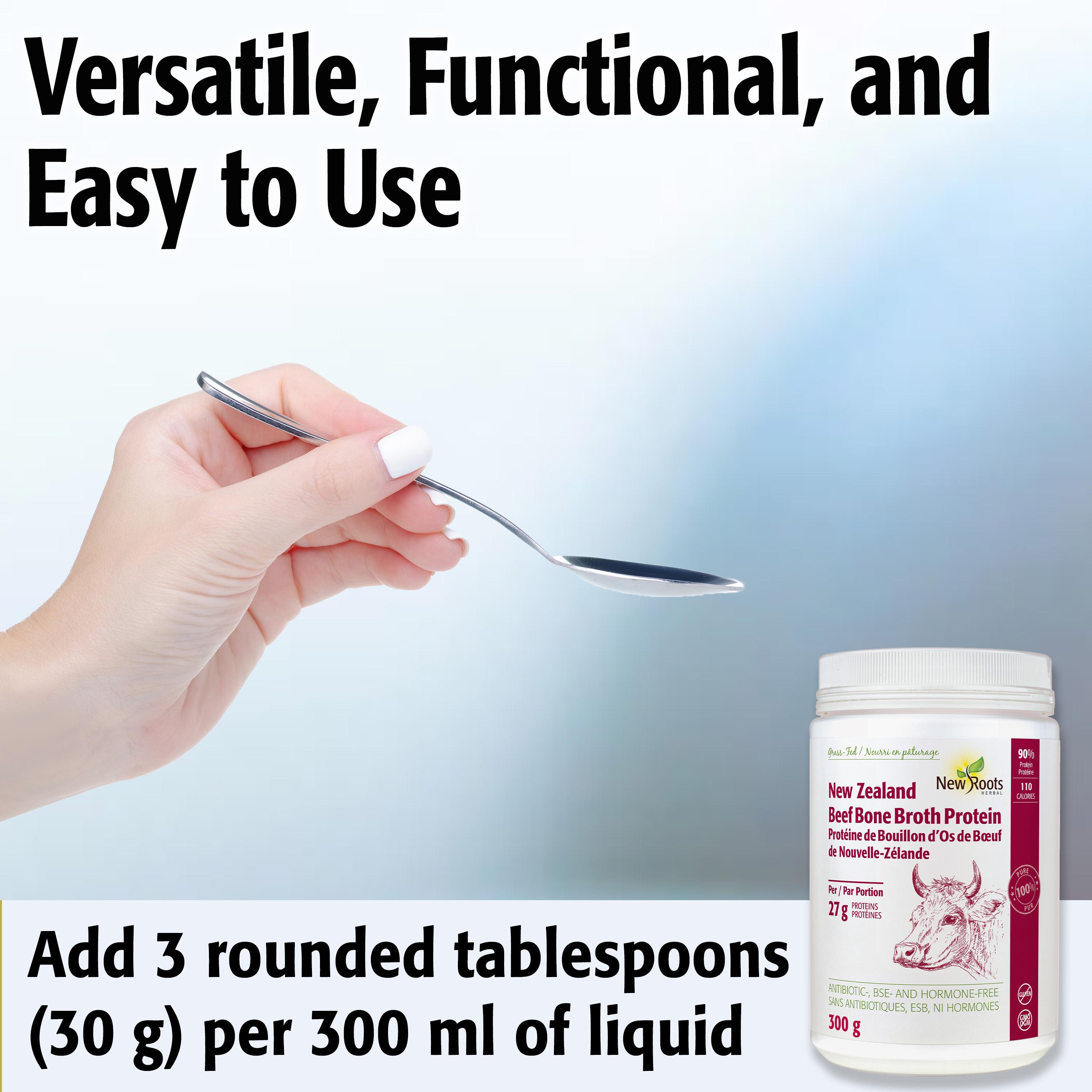 Pump up the protein content of soups, stews, and sauces; or serve it solo as a delicious bouillon “on-the-go.” For a broth: Add 3 rounded tablespoons (30 g) per 300 ml of hot water; if needed, add more water. Salt to taste. For recipe ideas, visit newrootsherbal.com/recipes.