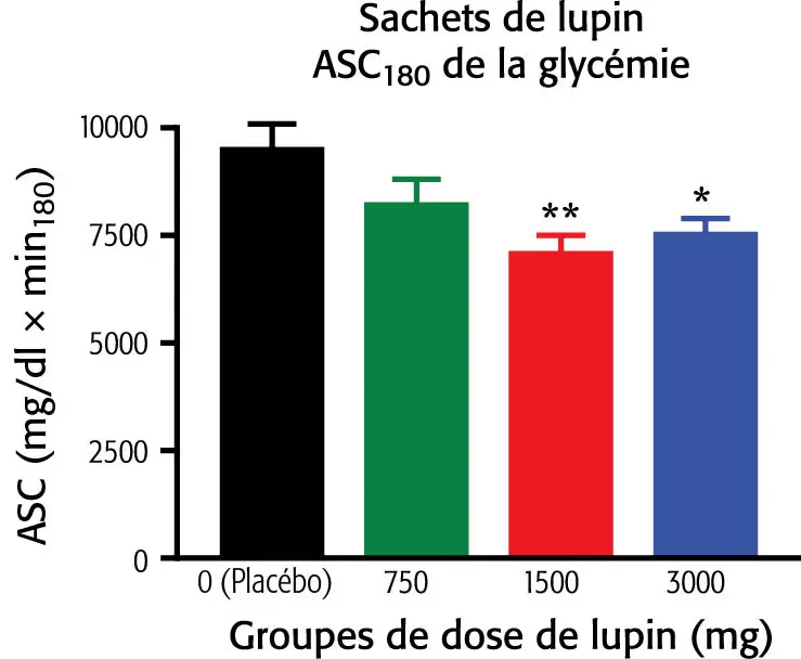 Un autre ERC portant sur 24 patients diabétiques a évalué l’effet de la poudre de lupin (contenant 12,5 g de fibres de lupin et 22 g de protéines de lupin) sur le contrôle de la glycémie après l’ingestion d’une boisson contenant 50 g de glucose, comparée à :