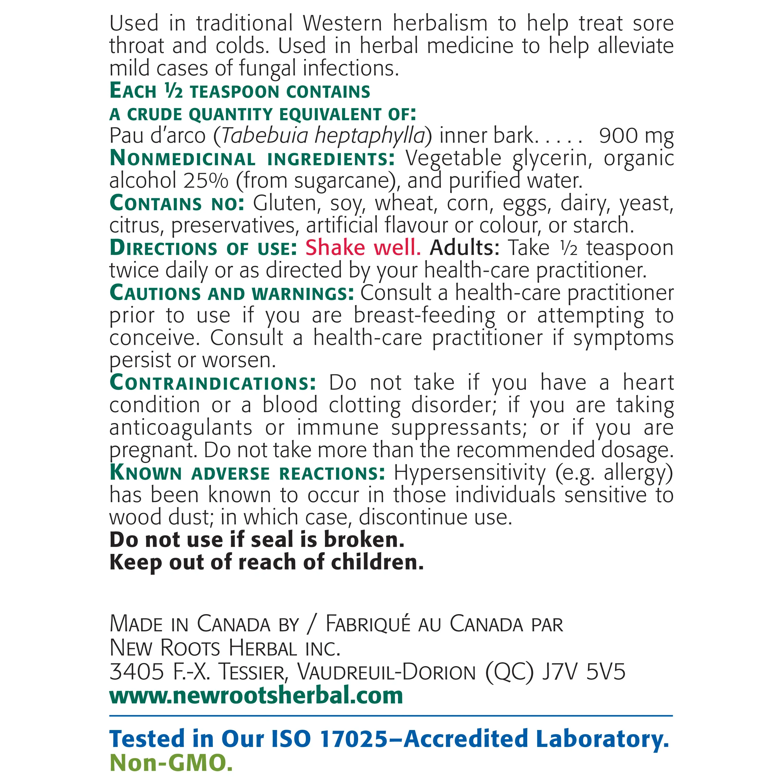 New Roots Herbal’s Pau d’Arco tincture has a woody and floral flavour.