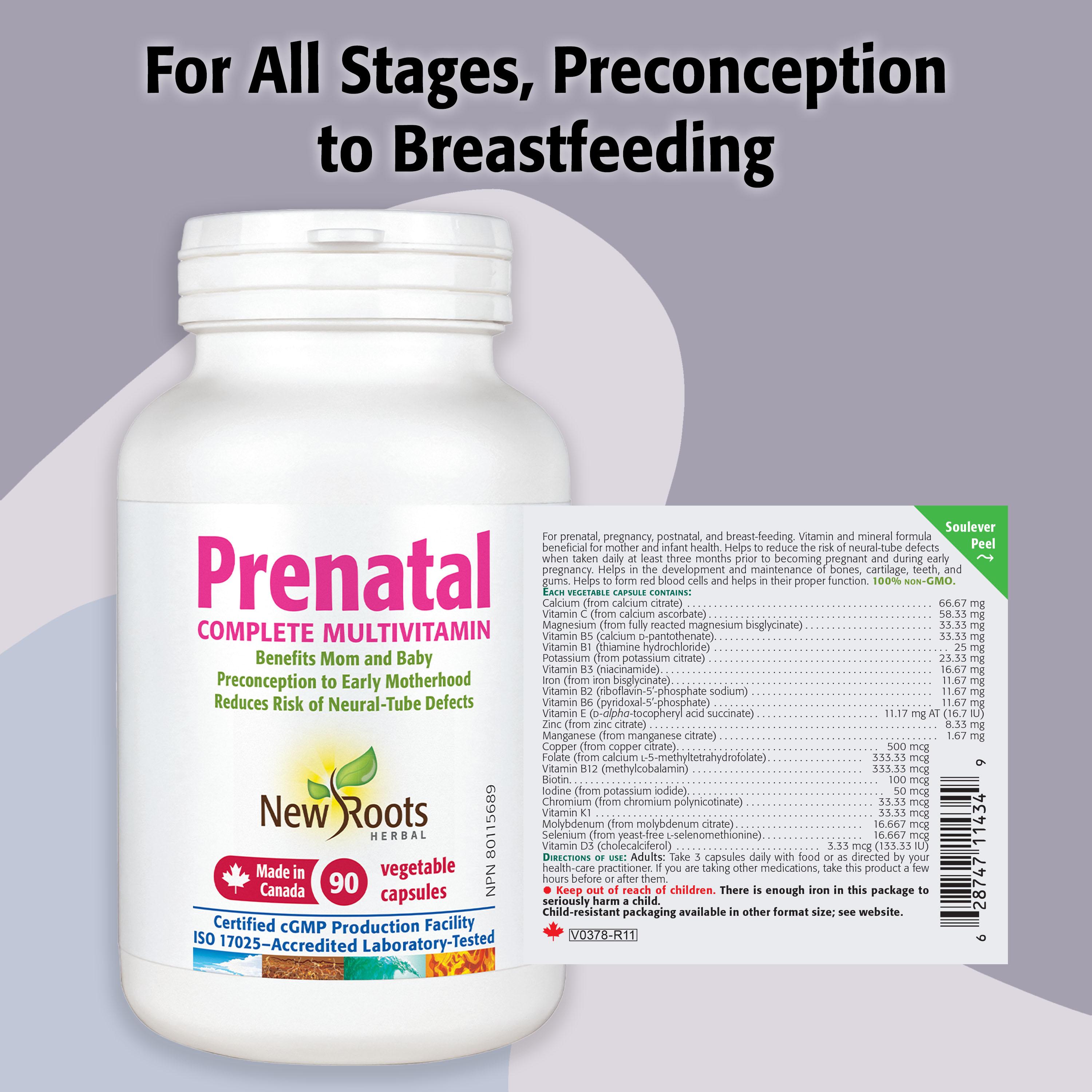 Not all vitamins are created equal. Many supplements use synthetic folic acid, which must be converted by the body before it can be used. For certain women, this conversion is less efficient, meaning they may not get the full benefit. New Roots Herbal’s Prenatal uses ʟ‑5‑methyltetrahydrofolate, the biologically active form of folate found in nature. Paired with iron bisglycinate—a chelated form of iron known to be gentle on the stomach—our formula ensures maximum absorption with minimal digestive upset.
